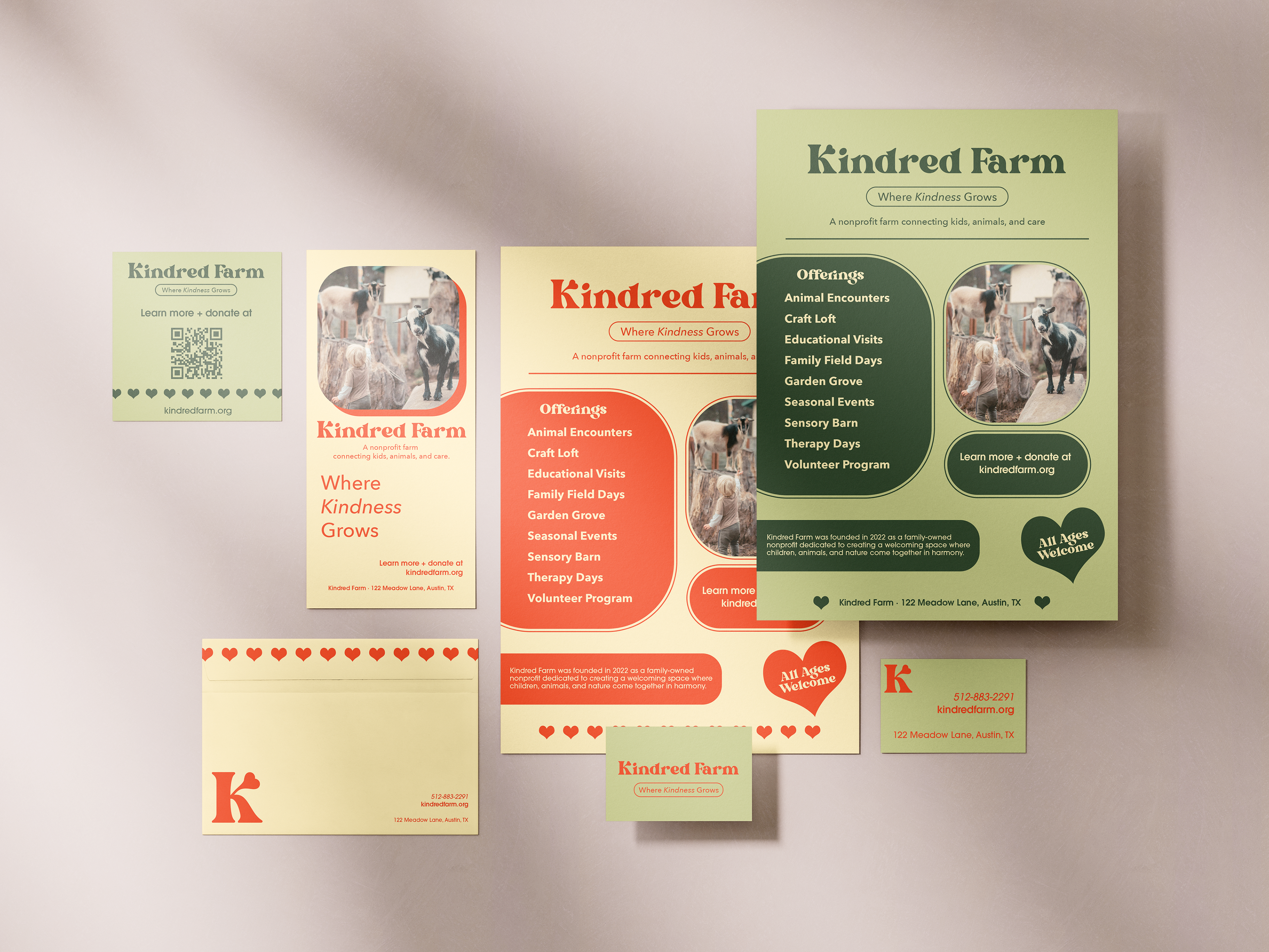 2025 | A friendly, farm-inspired brand built around a heart-shaped “K.” The warm palette and clean type extend across stationery and signage to create a cohesive, approachable look.