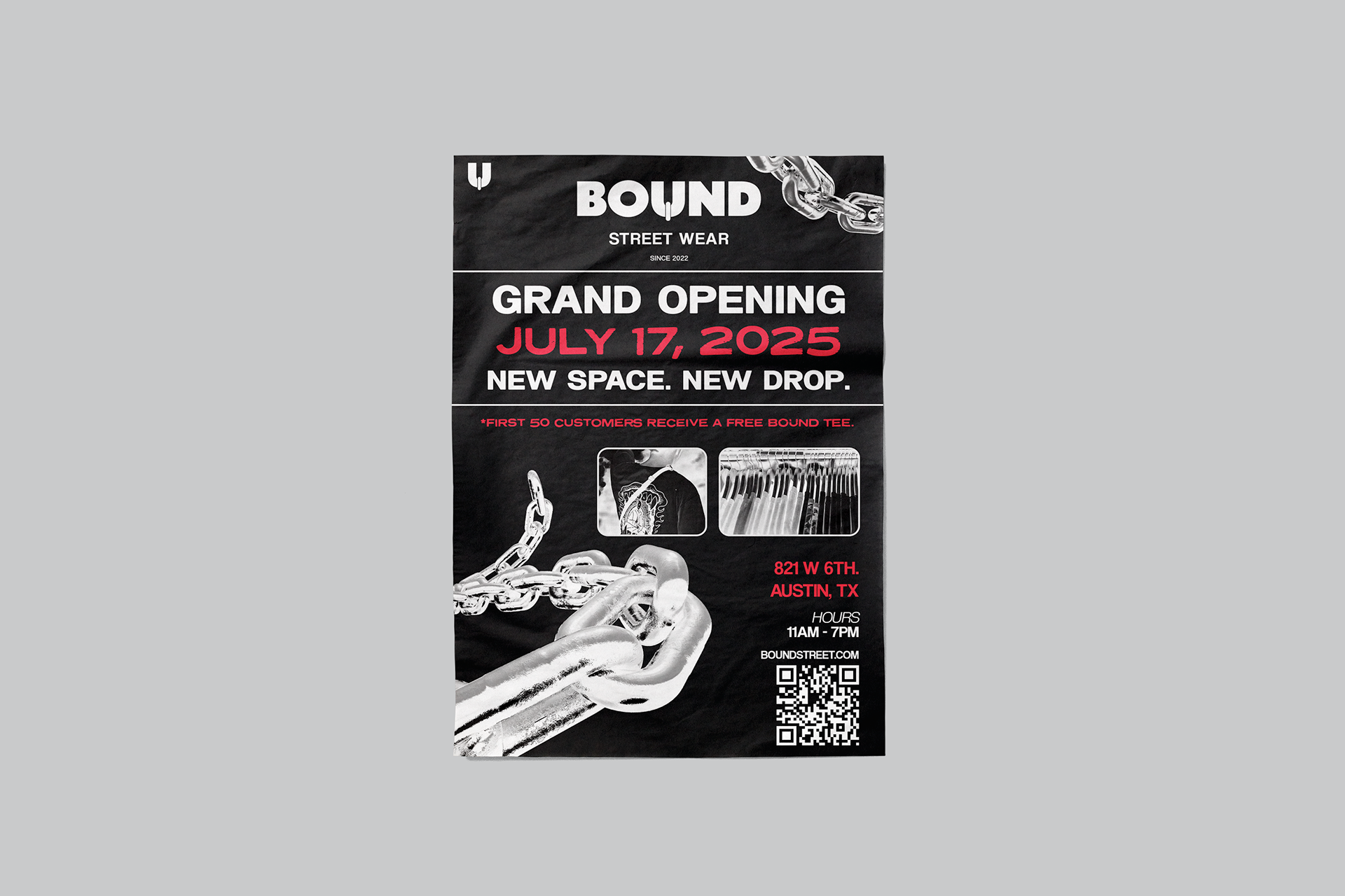 2024 | A grand-opening flyer for a streetwear brand. Using bold, stark colors and chain motifs, the design plays off the brand’s name and sets a strong, unmistakable tone.